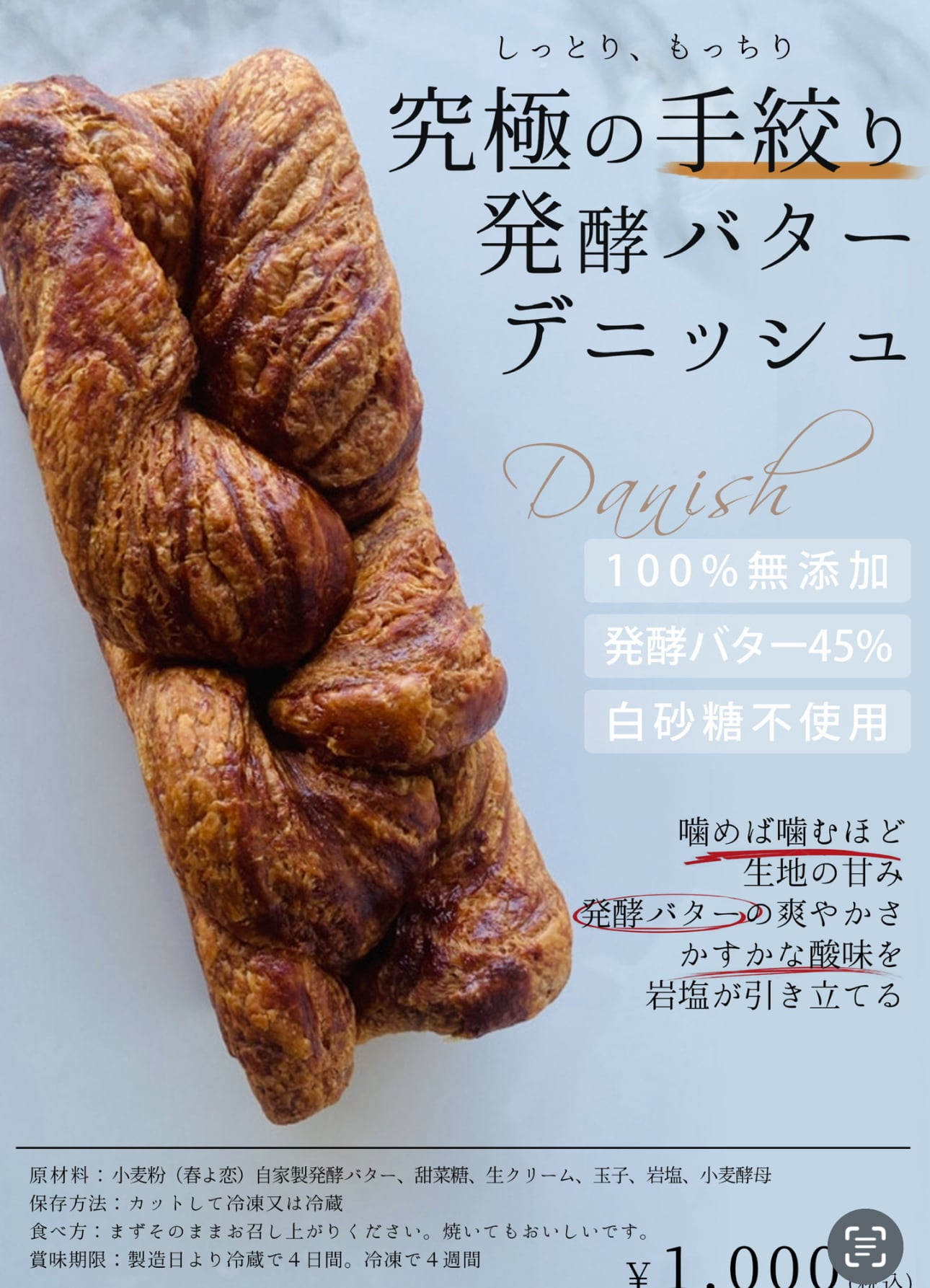 原材料:小麦粉(春よ恋)自家製発酵バター、甜菜糖、生クリーム、玉子、岩塩、小麦酵母