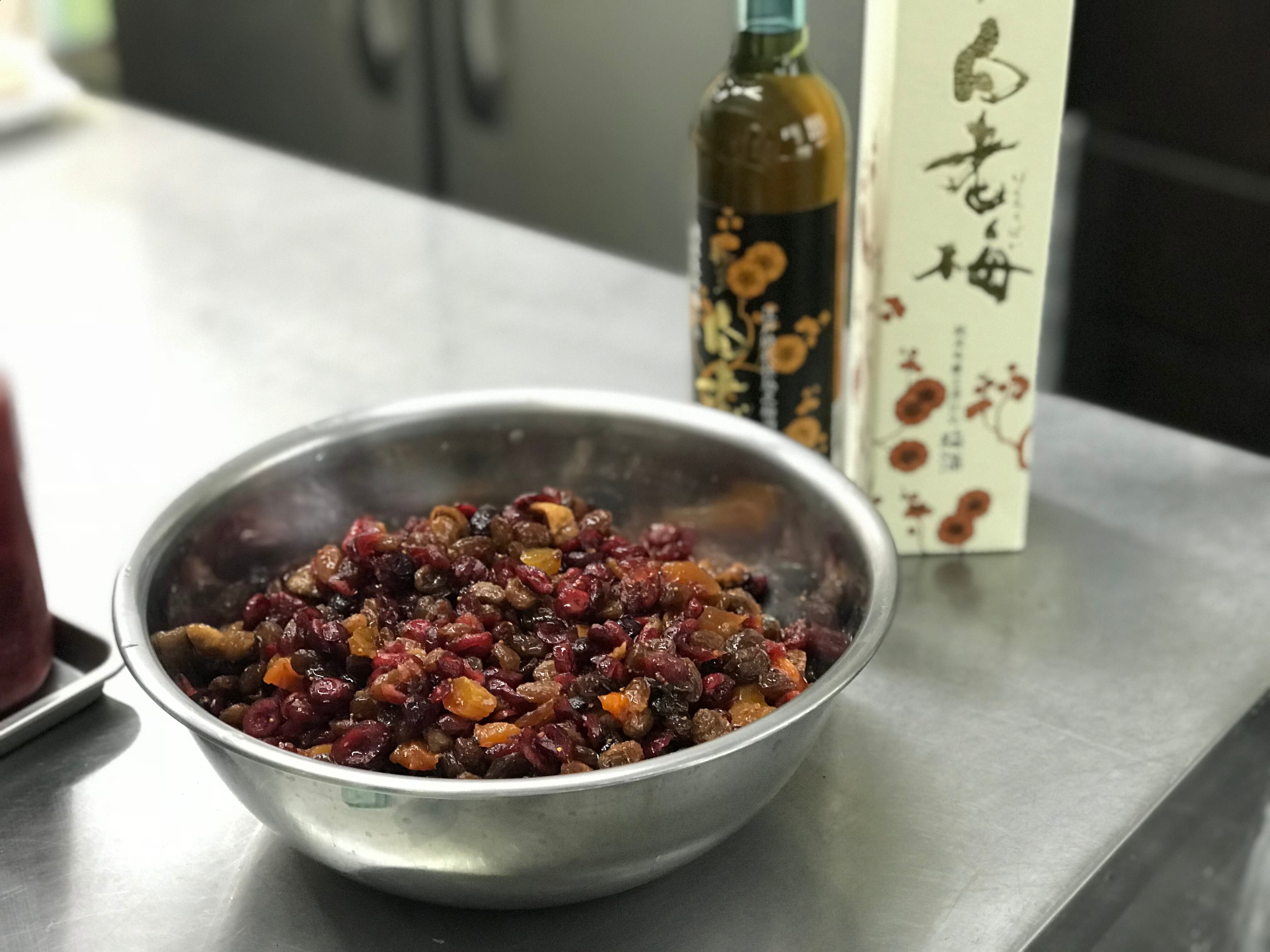 その「白老梅」にドライフルーツを漬け込みました。