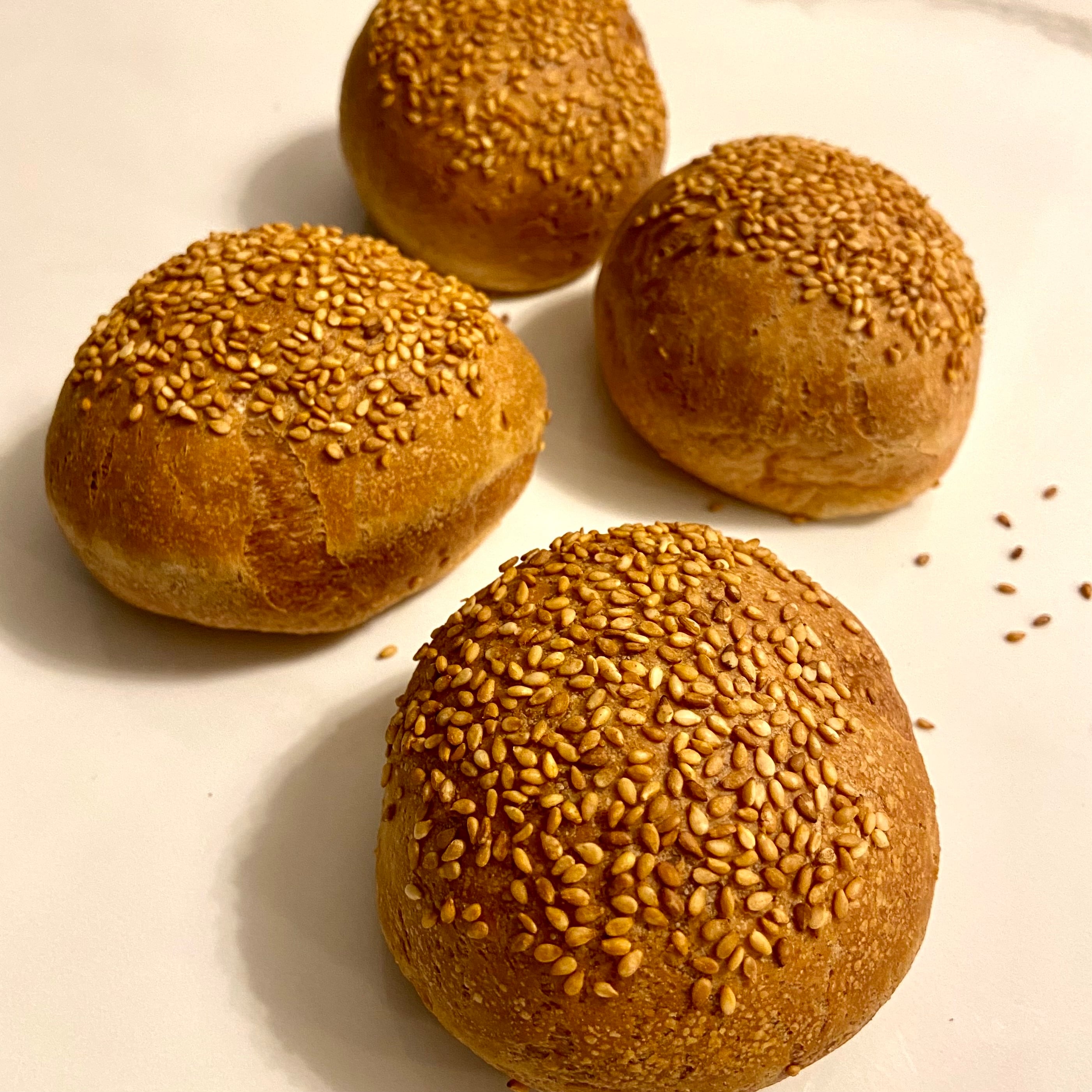 天使のほっぺをバンズにし、金のゴマを付けて焼き上げました。そのままでも、あんこやジャムを挟んでも。ゴマの香り、歯応えとバンズにして少し水分が飛んで歯応えが上がったほっぺの生地をお楽しみください。